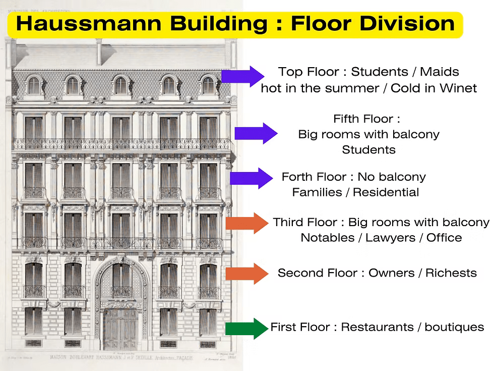 60 проценти од зградите во Париз се во изградени во Хаусманов стил. Хаусман бил француски буржоаски државник назначен од страна на Наполеон III кој во 19 век вовел радикална програма за урбанизација на Париз, и наредил сите згради да бидат изградени во еден ист стил и структура кој ја пресликува социјалната хиерархија на буржоаското општество. Па така најдолу се наоѓаат самите дуќани, ресторани, бутици итн, над нив на вториот спрат живеат газдите на дуќаните или најбогатите буржуи од сопственичката класа, третиот спрат е за битни личности, адвокати или за канцеларии односно буржуи од средната класа, од четвриот спрат веќе за работниците со своите фамилии кои работат за газдите, а најгоре под самиот кров во најмалите соби од само неколку квадрати живеат хигиеничари или мајстори, со заеднички тоалети и „микроапартмани“ во кои во лето е премногу жешко, а во зима премногу ладно.