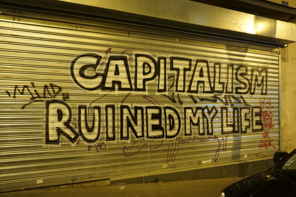 Што се однесува на работничкиот отпор видлив од улиците на Париз, нашиот објектив успеа да „фати“ еден постер на една анти милитаристичка и анти НАТО демонстрација, како и еден графит во една од работничките населби со натпис „Капитализмот ми го уништи животот“.